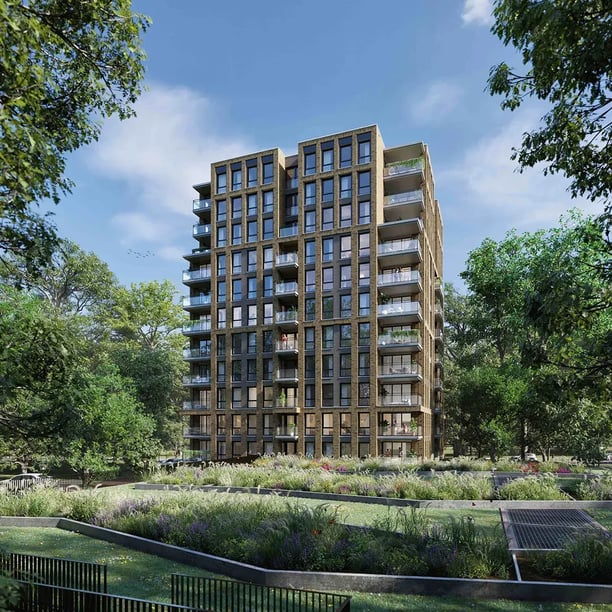 12 bouwlagen met 75 appartementen aan de rand van het bos